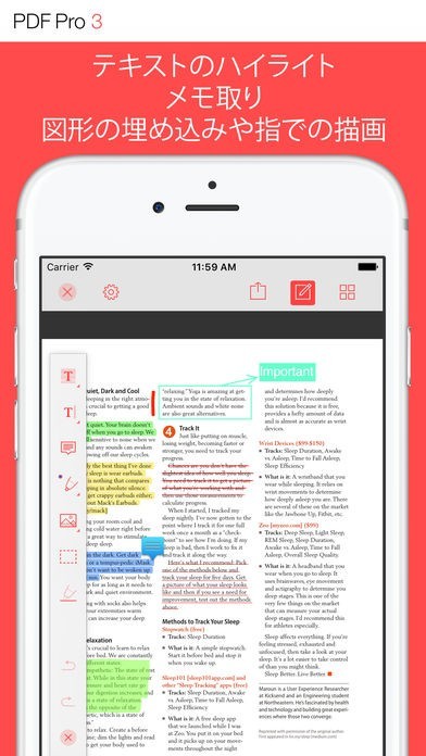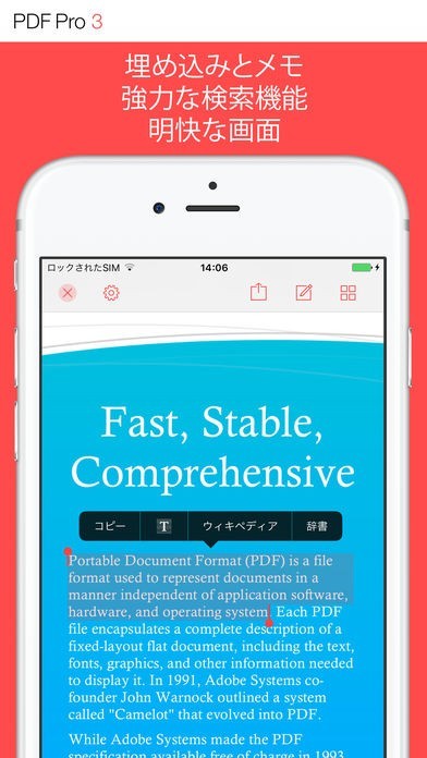 PDF Pro 3は、iPhone上でPDFファイルをチェックすることができるだけではなく、編集作業を行うことができるアプリです。文章を修正したり、付箋を付けて強調することができます。これらの作業は、簡単な図形を使ったメモやイラストを使って行うことができるので見た目にもわかりやすく、第三者に情報を伝える際に重宝します。ファイル全体からキーワードを使って該当する場所を検索することができます。また、ファイル情報をほかのユーザーと共有するのも簡単です。