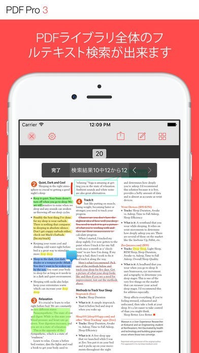 外出的でもPDFファイルのチェックや編集がしたい、そんな時には「PDF Pro 3」が使いやすくなっています。編集機能で気になる部分にハイライトを付けることもできる他、図形の埋め込みなども可能。パソコンで作っておいた資料を出先で読みつつ、手軽にチェックすることができます。さらに使いやすい検索機能も用意。フリーワードを入力するだけでPDFを保存したライブラリ全体の検索が行えます。これまで1つずつファイルを開いて中身を確認していたという方も手間を削減できるでしょう。また、ファイル管理機能を活用してラベル付けとタグの付与をしておけば、読みたい時にすぐにファイルを呼び出せるようになっています。