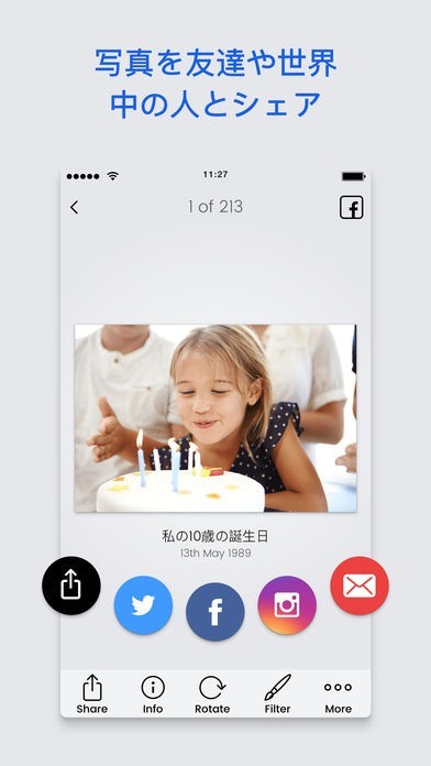 昔の思い出のアルバムを多様な用途で共有することができます。iCloudなどのクラウドサービスやInstagramなどのSNSまで対応しています。昔なじみ達と共有して思い出を分かち合いましょう。