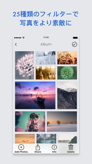写真に25種類のフィルターをかけられるので、写真の雰囲気に合わせてアレンジ可能
