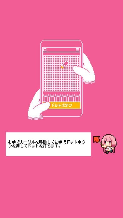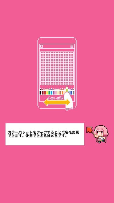 ドットピクト! かんたんドット絵アプリは80年台~90年台のテレビゲームの雰囲気を持ったドット絵を描くことのできる画像アプリです。ドットが敷き詰められた画面を塗りつぶしていくよう、直感的にドット絵を描けるようになっており、ひとつのドット絵に対して16色のパレットしか使えないところも往年の雰囲気が味わえます。