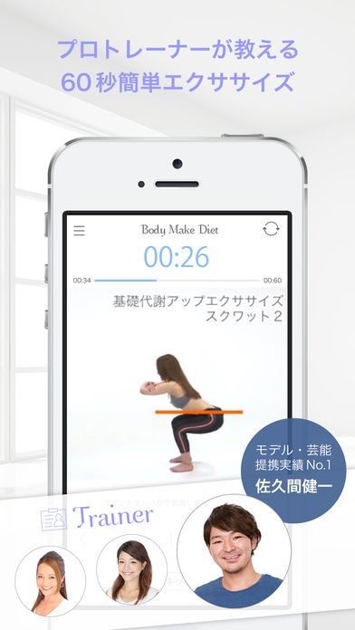 このアプリは、20000人以上を担当してきたトレーナーの佐久間健一さんが監修しているので、実績は十分であり、信頼してトレーニングに取り組むことができます。 1日わずか60秒ですむので、面倒くさがり屋の方でも続けることが出来ます。 できることは、「ヒップアップ」や「膨らんでいるお腹の改善」などがあるので、気になっている部分があれば、そこを集中的に鍛えたり、理想のカラダを選んでそのカラダになるために行動することも出来ます。 動画によってやり方を把握することが出来るので、見たものをそのまま真似するだけなので、学習しやすいです。 他には体重や体脂肪率を毎日記録しておいて、グラフによって表示することも出来ます。