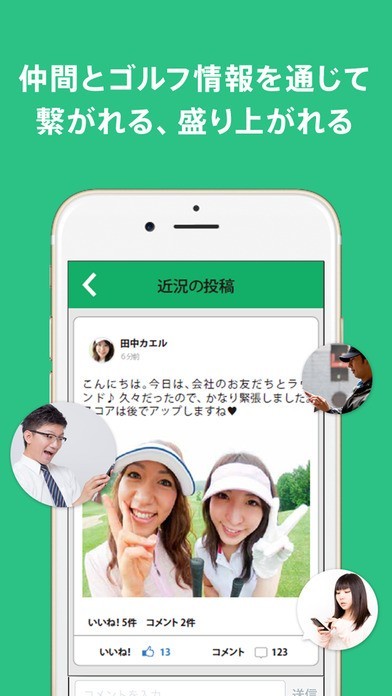 自分のゴルフに関する近況を写真で投稿して、ゴルフ仲間と共有ができたり、友だちの投稿に対して「いいね!」「コメント」ができます。