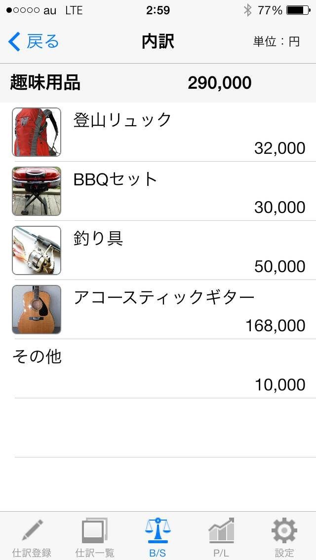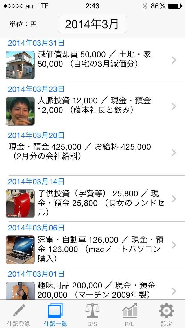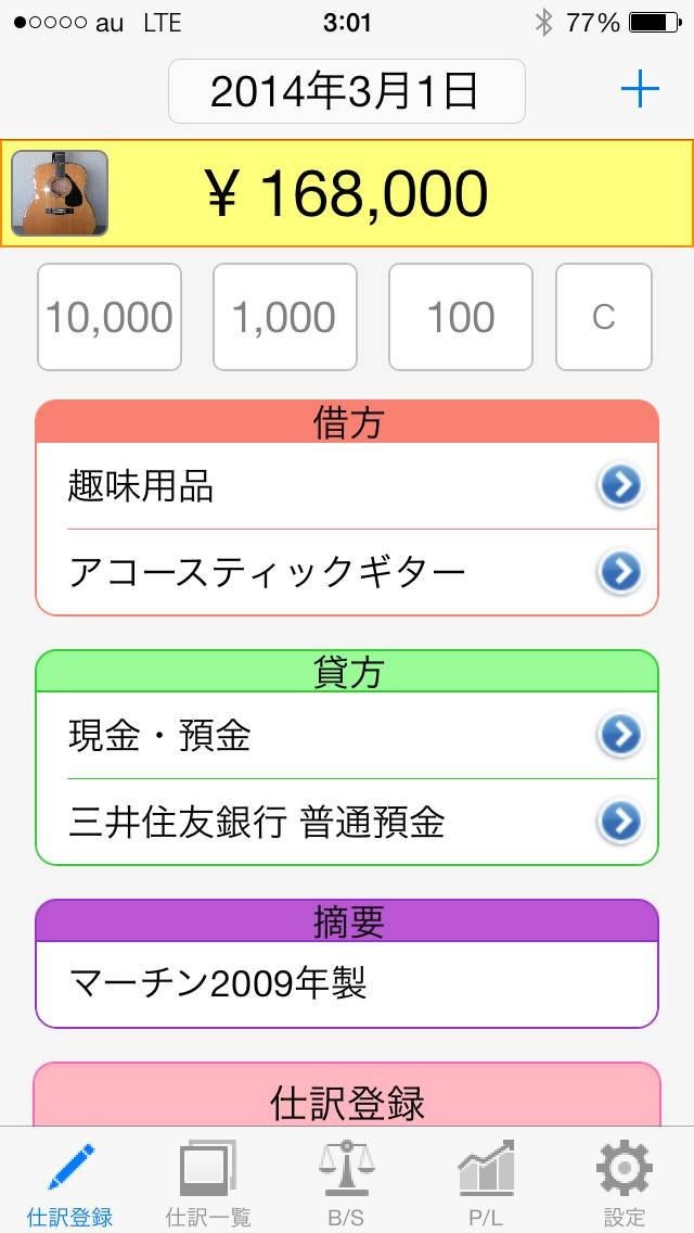 家計簿のように日々、細かく入力をする必要はありません。大きな買い物をした時にだけ、このアプリで仕訳を入力して下さい。
