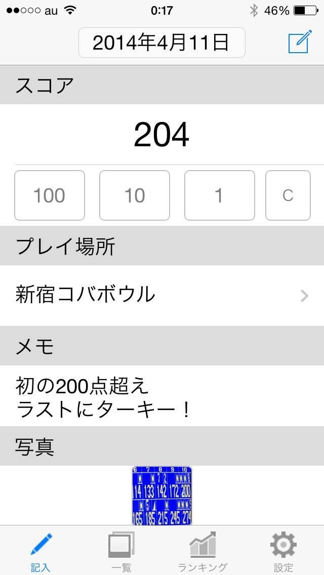 スコア、場所、メモ、写真、この3つの情報を入力するだけ。
