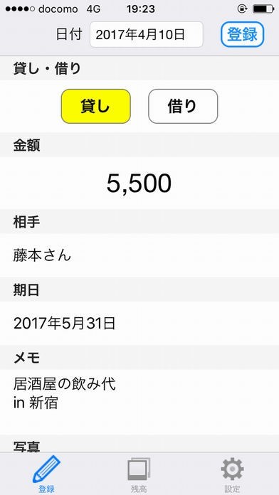 借りた金額が登録出来るだけでなく、利用用途をメモに保存する事が可能なので、資金管理に役立ちました。