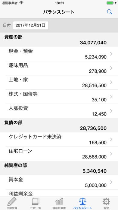 日々の収入、支出が見やすい画面で丸わかりです。細かい出費は表示されないので、全体の収支状況がより分かりやすいのが特徴です。バランスシートもあるので、本格的な収支表を見ることができます。