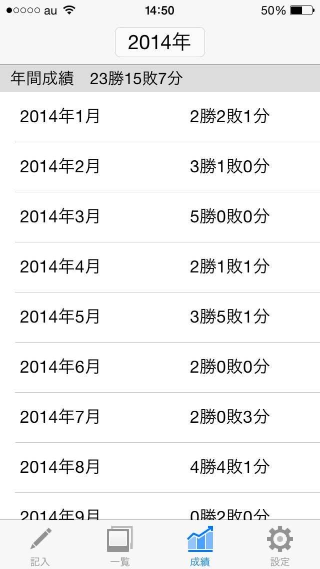 このアプリは過去の試合結果一覧、月間成績、年間成績を見やすい形で表示してくれます。