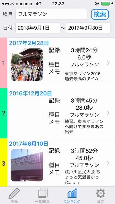 マラソンのベストタイムを登録する事が可能で、ランキング順で表示出来るところが魅力的でした。日記に写真やメモを追加出来るのも良かったです。