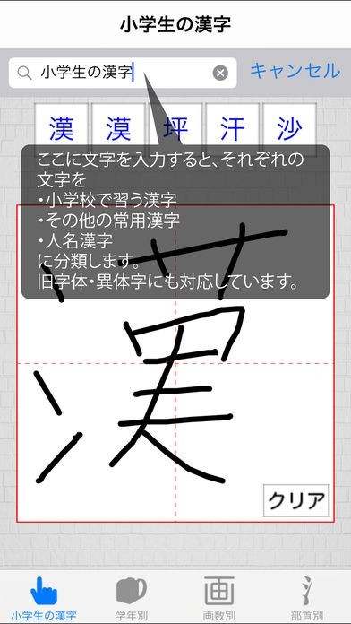 小学生の漢字 - その字は習った?は、手書き文字入力機能を使って小学生で習う漢字がわかり、書き順や画数など漢字の情報を知ることができます。手書き入力すると候補の漢字が出てくるので、読みがわからなくても簡単に調べることが可能です。小学何年生で習う漢字であるかわかるので、学校からの子供宛の手紙作成依頼の時などに便利です。文章入力機能では、個々ではなくまとめて漢字を調べることができます。それぞれ何年生で習う漢字なのか、一目でわかります。漢字は、各学年ごとの教科書を読み返さないと何年生で習ったものなのかを調べることが難しいものです。子供が見てもわかりやすい表示で、親子で漢字を勉強するときにも使えます。