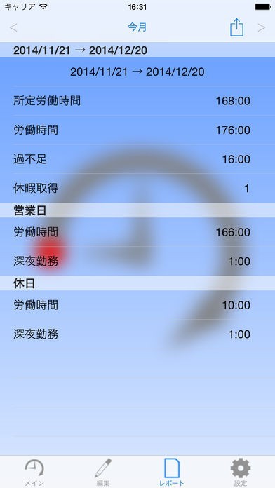 1ヶ月間の勤務時間や残業時間、深夜勤務時間、休日勤務時間を自動で計算!