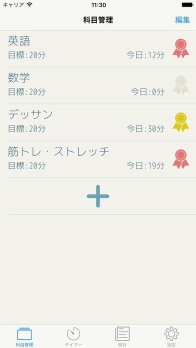 目標達成タイマーは、毎日行いたい予定をタイマーで管理できます。科目管理機能で勉強したい科目やトレーニングしたい項目を設定します。変更したいときは、編集ボタンから簡単に設定の変更が出来ます。タイマーで、目的別に予鈴や本鈴などタイマーを設定して、開始します。終了すると、自動的に時間が記録されていきます。今日の分や期間で統計の情報を表示することができ、科目や期間も確認できるので、勉強やトレーニングの進み方がわかります。毎日無理なく続けることができ、統計を見て毎日の頑張りがわかります。モチベーションを保ち続けたいときに役立ちます。
