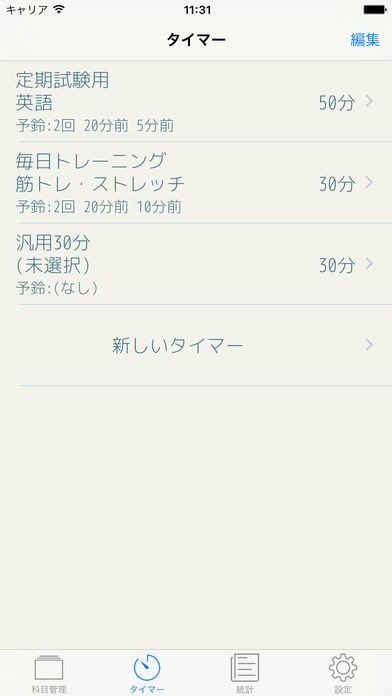 タイマーで、目的別に予鈴や本鈴などタイマーを設定します。毎回終了すると、自動的に時間が記録されていきます。タイマーは複数作ることが出来るので、数種類準備しておくことが可能です。