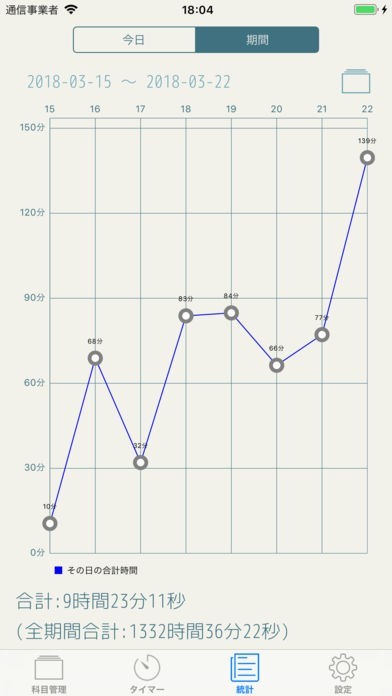 目標達成タイマーは、毎日行いたい予定をタイマーで管理できます。今日の分や期間で統計の情報を表示して振り返ることが出来ます。科目や期間も確認できるので、頑張りがわかります。