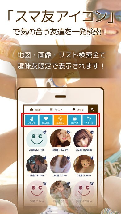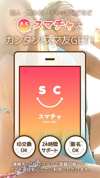 「スマチャ」は、アプリ上での会話を通じて自分と気の合う相手を見つけることができるアプリです。電話番号やメールアドレスを登録する必要がないため、個人情報が漏れてしまう心配がありません。検索機能が充実しているため、自分と同じ目的でアプリを利用している人と出会いやすくなります。友達や恋人探しはもちろん婚活も行えます。