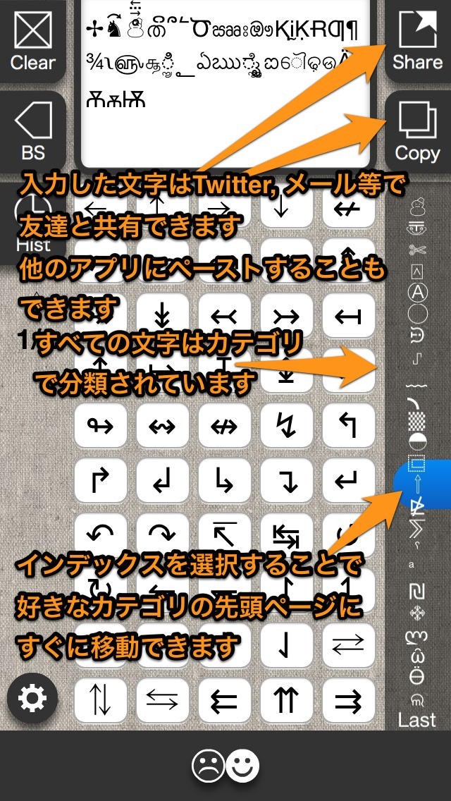 最新の顔文字を見ると様々な表情や感情を表現したり、とても可愛いものがあったりと、製作者の想像力に関心させられるものです。 それを可能にしているのが特殊記号なのですが、『特殊文字』を使えば、スマホでも豊富な特殊記号が簡単に使用可能になります。 本アプリには、6000以上もの特殊文字が収録され、シンプルな作りと分かりやすいユーザーインターフェースで操作は簡単です。 数が膨大ですが、カテゴリ分けされた記号は設定画面で使用の可否が選択出来たり、表示順を変更させられるため、使用頻度の高いものを上位に位置付けることで使いたい時にすぐ見つけられます。 記号はメールやLINEなどに使用可能なため、コミュニケーションで役立ちます。 特殊記号は工夫次第でオリジナルの顔文字を作ることも可能なため、誰もが使いたくなるようなユニークなものを作ることも出来ます。