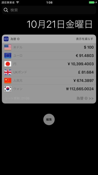 ウィジェット機能にも対応しており、ホーム画面を立ち上げた段階で、指定の通貨換算結果を常時表示されておくことができます。編集ボタンで通貨セットは自由に変更することができるので重宝します。