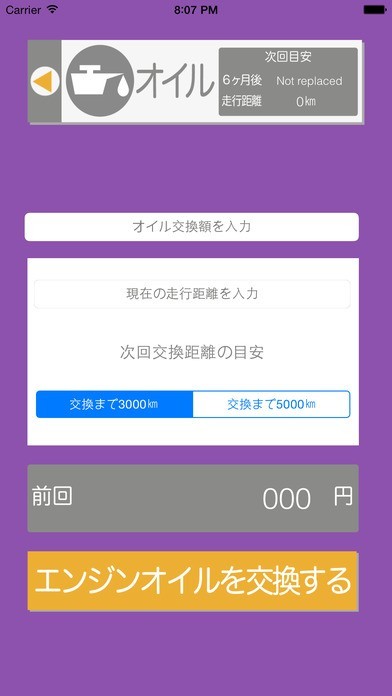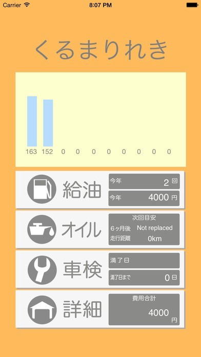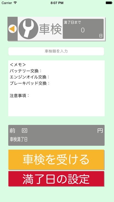 給油額・給油回数・エンジンオイル交換時期(6ヶ月後の日付を記憶します)・次回車検満了日までのカウントダウンを手軽に記録しておくことができます。