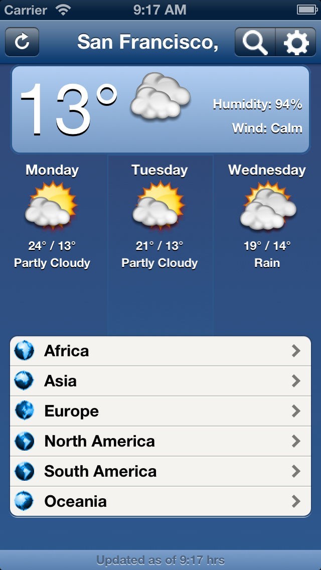 様々なエリアに対応していて、ヨーロッパやアフリカ等の天気が細かく検索出来るようになっています。風速や湿度等の情報にも対応しているので、旅行の予定がある方に必見ですね。