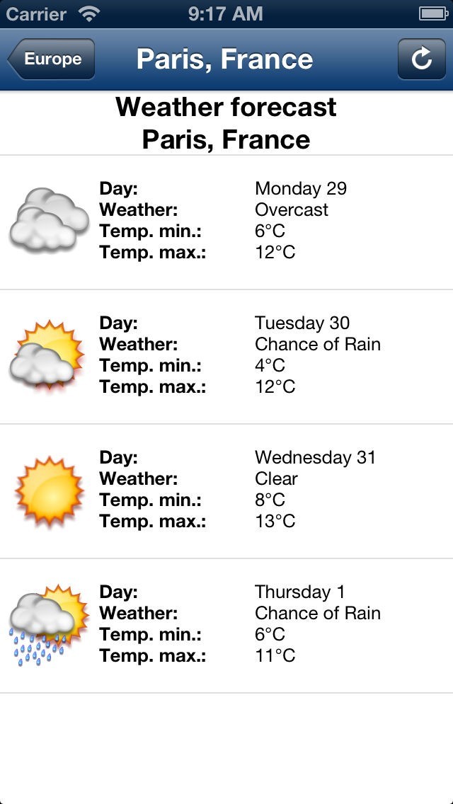世界の天気を見たい時にこのアプリでその国の天気を検索すると天気予報が出て便利です。その国の気温や天気、1週間予報も出て前もって準備することができてとてもいいと思います。
