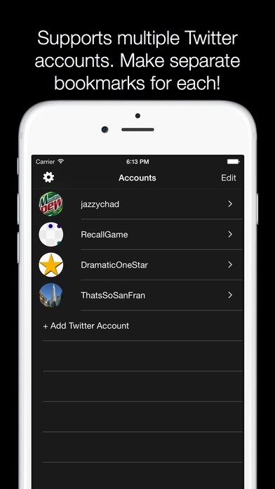 Supports multiple Twitter accounts. You can create sets of bookmarks for each account!