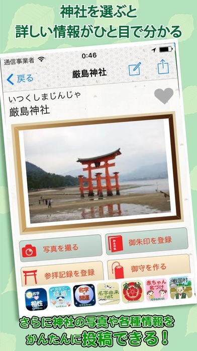 このアプリでは、自分が神社に参拝した記録を、自分が撮影した写真と文章と共に残すことができます。旅行の記録としても活用することができるので、大変使い勝手の良いアプリです。
