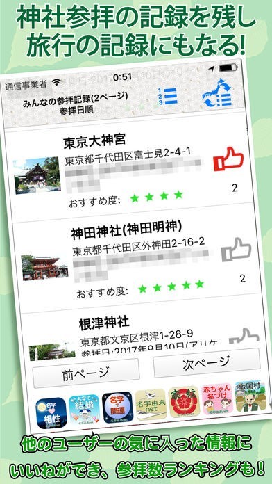 このアプリでは、他のユーザーが作成した神社に関する情報や参拝記録を見ることができるので、神社を訪れる際の参考にすることができます。また気に入った情報には「いいね」をすることができます。