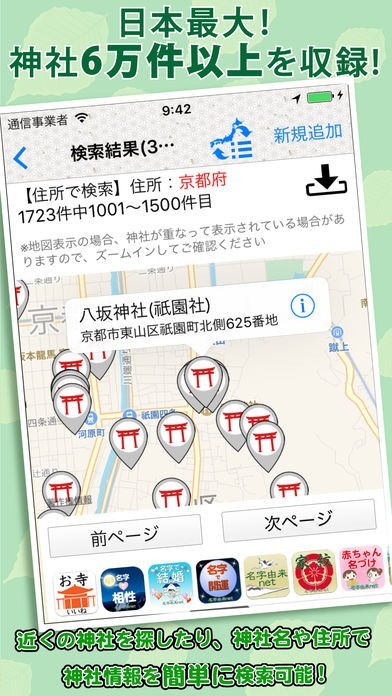 6万件以上の神社の中から、気になる神社は住所や地図で場所を確認することができます。携帯の位置情報と連動させれば、自分のいる場所から神社までのルート検索も可能です。