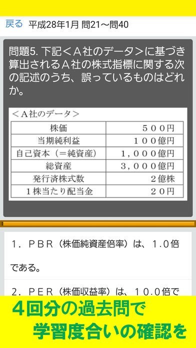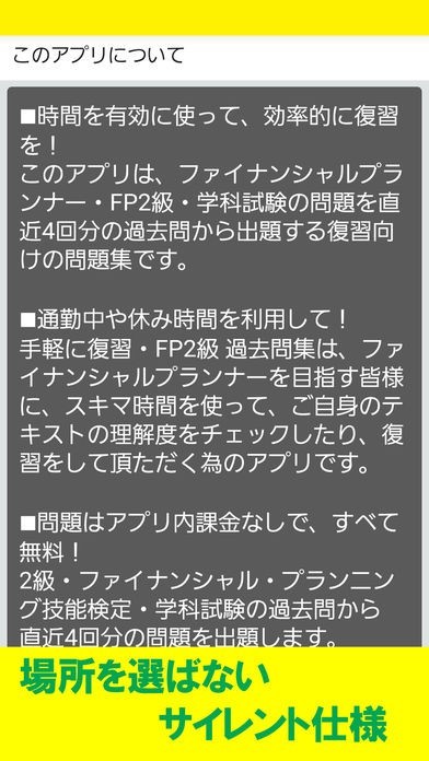 このアプリは、ファイナンシャルプランナー・FP2級・学科試験の問題を直近4回分の過去問から出題する復習向けの問題集です。