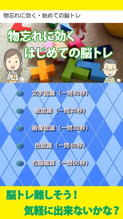 物忘れに効く・初めての脳トレは、初心者が気軽にできる脳のトレーニングです。認知症の予防に脳を刺激する簡単な問題にチャレンジできます。認識機能が4つあり、画像認識と文字認識、数認識、色認識の問題が選んでできます。右脳暗算は、イメージでそろばんを動かして行うので、頭を使っているのが感じられます。物忘れ対策をしたい方に、短時間で脳トレができて暇つぶしになります。画面の色がカラフルで、文字が大きめなので読みやすく、自然と頭に入りやすいです。