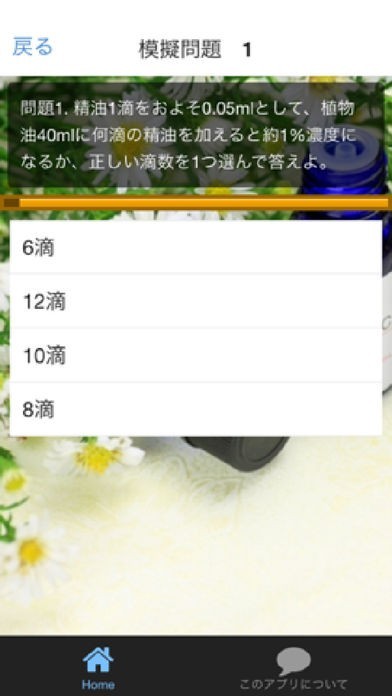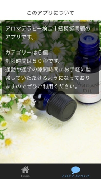 アロマセラピストになりたい方や、アロマサロンを開業したい方はアロマテラピー検定1級を受けると思いますが、このアプリは模擬試験が解けます。1級の問題を凝縮して出題してくれるので、力試ししたい時にいいでしょう。各問題に対して50秒の時間制限がありますので、試験本番の時間配分を把握するにも便利でしょう。問題に間違えても、解説がついてきますのでその場で改めて学習することができます。過去問集を持ち歩く必要もないので、空いた時間にスマホで簡単に問題を解いてはいかがでしょうか。