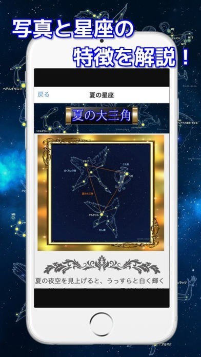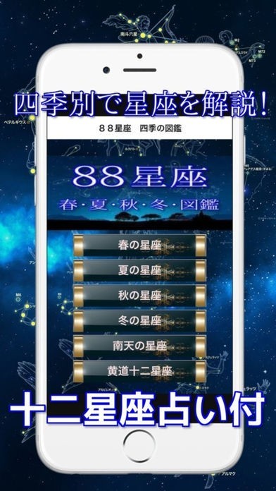 App Storeより引用88星座 四季の図鑑は春・夏・秋・冬の四季別にまとめました。88星座と春の大三角・夏の大三角・秋の大四角形・冬の大三角を絵だけでなく星座の見方や、星座のまつわるギリシャ神話も解説しています。
