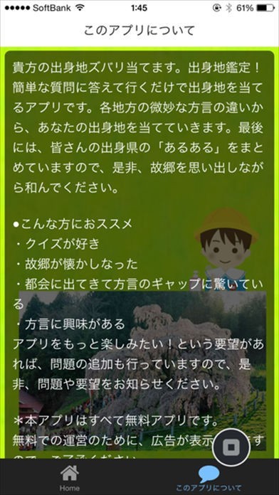 App Storeより引用貴方の出身地ズバリ当てます。出身地鑑定!簡単な質問に答えて行くだけで出身地を当てるアプリです。各地方の微妙な方言の違いから、あなたの出身地を当てていきます。最後には、皆さんの出身県の「あるある」をまとめていますので、是非、故郷を思い出しながら和んでください。
