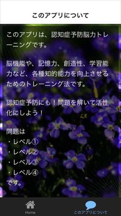 認知症予防脳トレクイズ漢字・計算は、5種類ある難易度の異なったクイズの中から、自分に合ったレベルのクイズを選んで脳のトレーニングをすることができます。計算や漢字などのクイズから、脳機能や記憶力、創造性、学習能力を高めていきます。認知症予防は、脳を活性化させることが大切です。簡単な問題から無理なく取り組めます。認知症が心配な方にクイズを出したり、ちょっとした空き時間を利用したトレーニングにも活用できます。高齢者だけでなく団塊世代のビジネスマンも高齢化社会に向けて、認知症にならないように取り組む機会になります。画面の背景は、青色の花が使われておりすがすがしい気持ちで取り組めます。