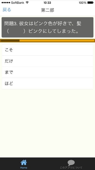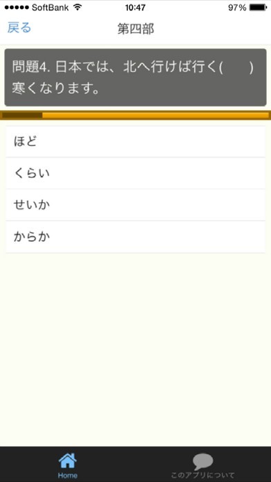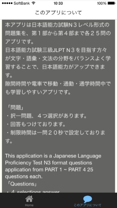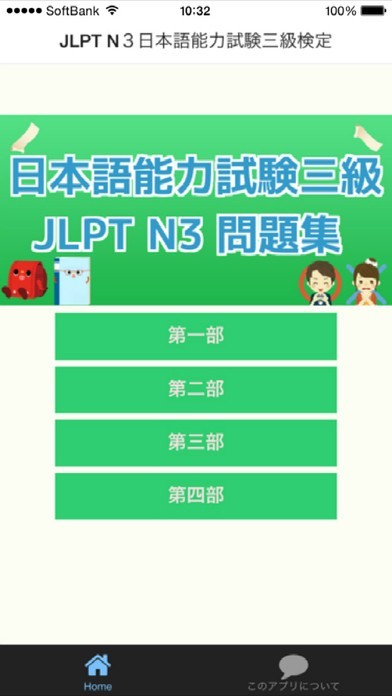 App Storeより引用本アプリは日本語能力試験N3レベル形式の問題集を、第1部から第4部まで各25問のアプリです。