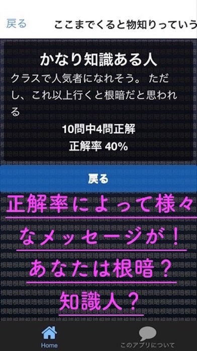 クイズを最後まで行うと、クイズの出来によって様々な方面からの辛辣なコメントを見ることができます。