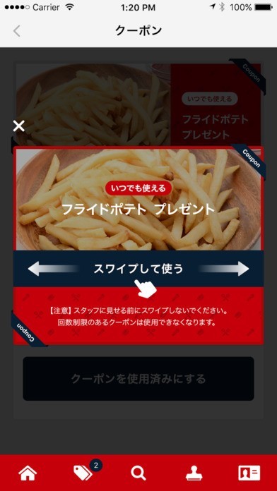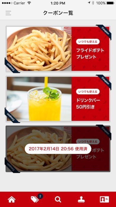 アプリ限定のクーポンが利用できます。フライドポテトプレゼントやドリンクバー50円引きなどいつでも使えるクーポンがたくさん用意されています。お得なイベント情報の提供もあります。