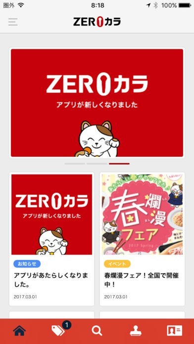 高校生限定サービス「ZEROカラ」と18歳~22歳対象の「ZEROカラ+」の会員にお得な情報を提供しています。店舗の最新情報やクーポンがゲットできるほか、入店時にケータイ会員証として表示できます。