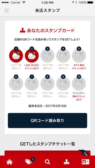 来店スタンプ機能が搭載されており、店舗に設置されている専用のQRコードを読み込むことで来店スタンプをゲットできます。たくさん集めることでお得なプレゼントをゲットしてください。