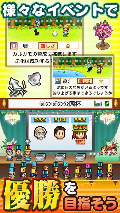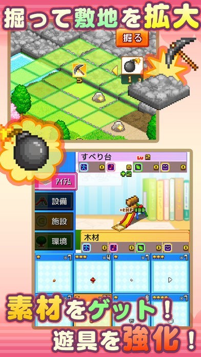 開拓して公園を作り上げていくシミュレーションゲームとなっています。ベンチや遊具など公園らしいものをどんどん設置していきましょう。大きくなってくると入場料が入手できるようになります。その資金を使ってさらなる成長をしていきましょう。