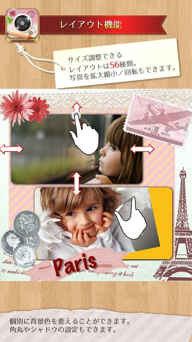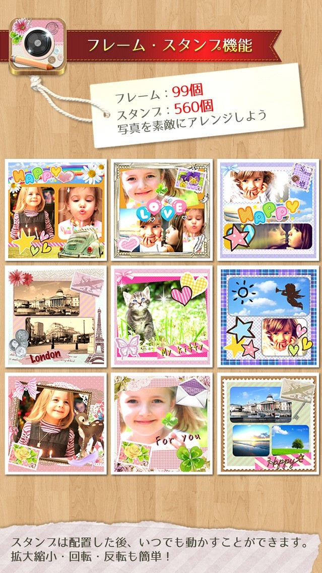 旅行写真やデート写真を可愛く複数枚を1枚に出来るアプリが「デコ&フレーム InstaDeco - Instagramをもっと素敵に写真を文字入れ&プリクラ・コラージュ」です。 デコ&フレームは、1~9枚までの写真を1枚にレイアウトすることができます。 また、フレームの数は99個、スタンプの数はなんと560個も収録されているので可愛らしく彩り鮮やかな加工写真が出来上がるんです。 デコ&フレームは、スタンプは配置後に動かす事で好きな場所にレイアウトできるのでオリジナリティが溢れること間違いありません。