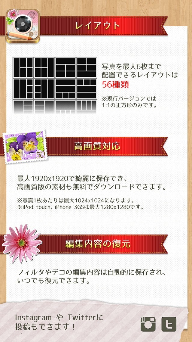 「デコ&フレーム InstaDeco - Instagramをもっと素敵に写真を文字入れ&プリクラ・コラージュ」スペック・仕様