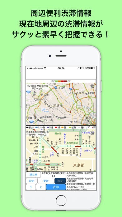 JARTICサイトの渋滞情報とGoogleマップの混雑情報を2分割表示で見ることができるアプリです。GPSで現在地を取得するので現在地付近の渋滞・混雑具合がすぐに分かります。スマホをシェイクするだけの操作で2分割表示を1画面にして大きな画面で見やすくすることもできます。 お気に入りに約100地点を登録できるので、よく行く場所までの道路情報が簡単に分かります。Googleマップを長押しするだけでお気に入りに登録できます。
