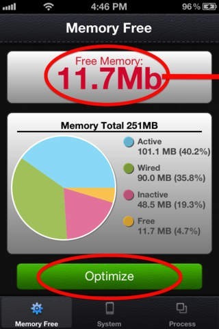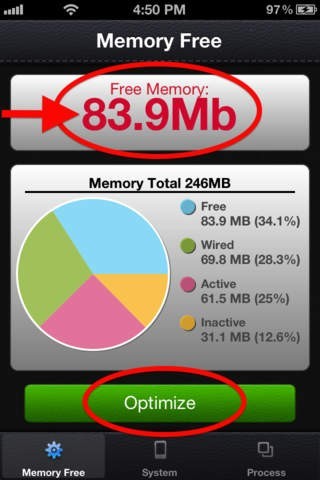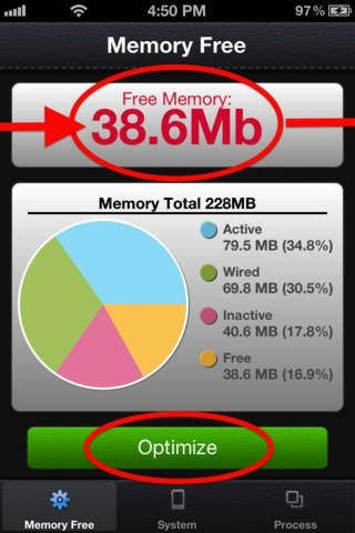 ☞下部のタップボタンをクリックします。その後、劇的に空きメモリの増加を見ることができます。