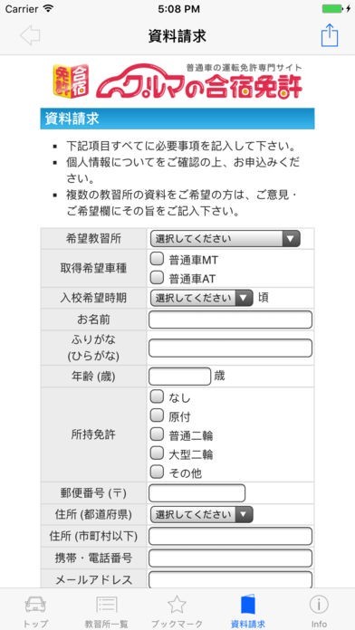 気になる教習所が見つかったら、アプリ内から資料請求をしてさらに詳しい情報をゲットできます。