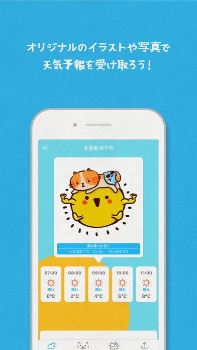 毎日確認する天気予報を、自分のオリジナルキャラクターアイコンで可愛くお知らせしてくれます。全国2000か所の地域の1時間ごとの天気予報、気温、降水確率、週間天気予報も配信します。