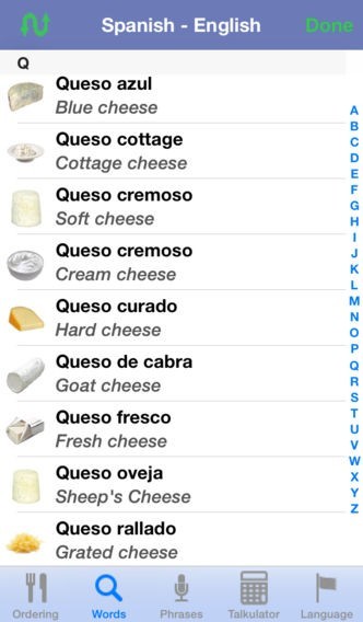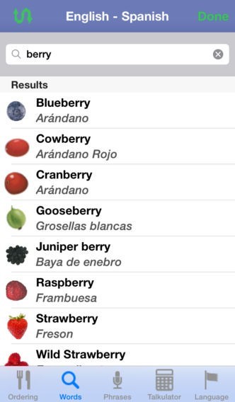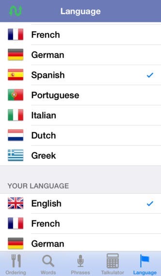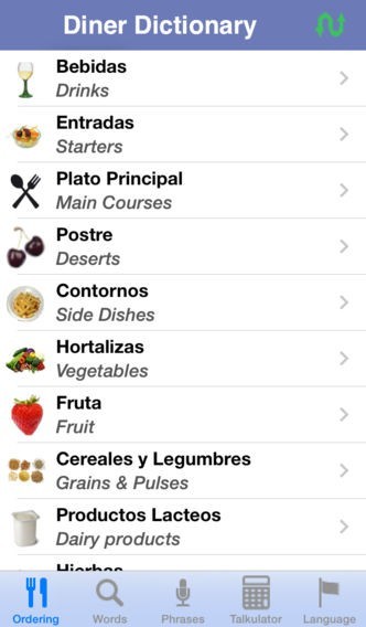 Diner Dictionary lists a wide variety of food items, ingredients, cooking terms and is a unique translation resource in the domain of food. All food-terms with speech in 8 languages, 2-way translation in English, French, Italian, German, Spanish, Greek, Portuguese and Dutch. No internet needed, the database is built-in, no roaming costs.