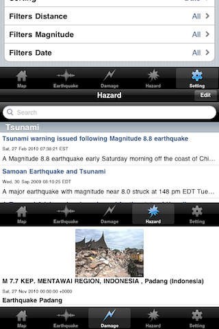 リアルタイムで世界中の地震、津波、火山、熱帯、洪水情報のレポートおよびマップを表示する