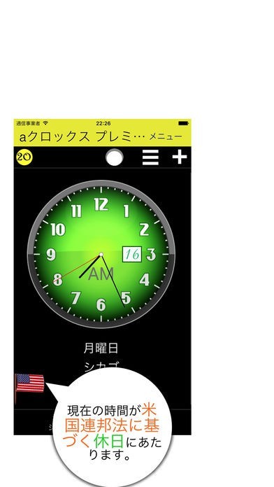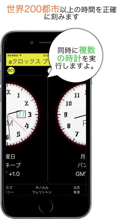 App Storeより引用aクロックス プレミアムは現存する「aクロックス」というiPhoneのみで利用出来るアプリに幾つかの新しい機能を追加したものです。これらの製品は同時に複数のアナログ時計を実行するためのものです。aクロックス プレミアムにのみ使える機能としては、22の時計のデザインが付随していること、米国の連邦法に基づく休日を認識すること、ロケーター・ボタンを色で差別化する機能などがあります。