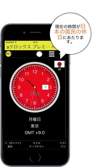 7. 選択されている都市が日本にあり、現在の時間が日本の国民の祭日にあたる場合は、時計の右上に特別な表示が現れます。